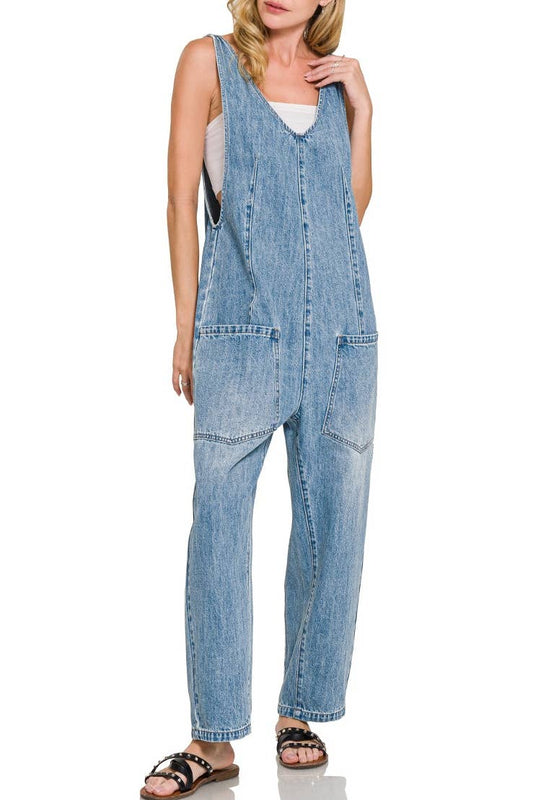 Denim Adjustable Strap Baggy Jumpsuit With Pockets