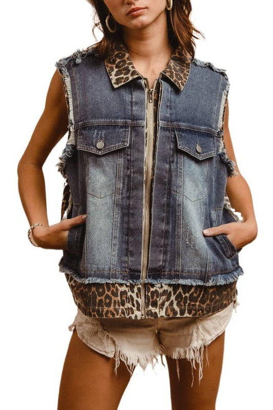 Leopard Mix & Match Washed Sleeveless Denim Vest