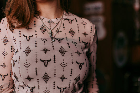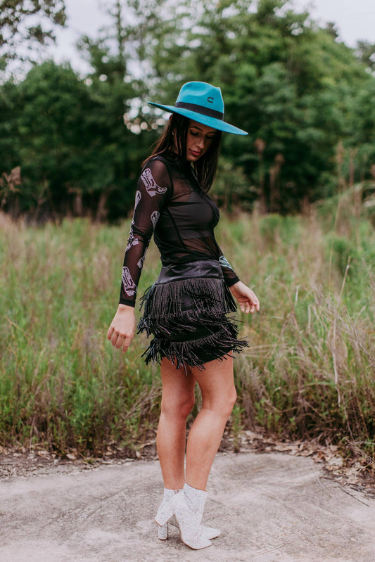 Black Rhinestone Western Boot Embellished Mesh LS Top
