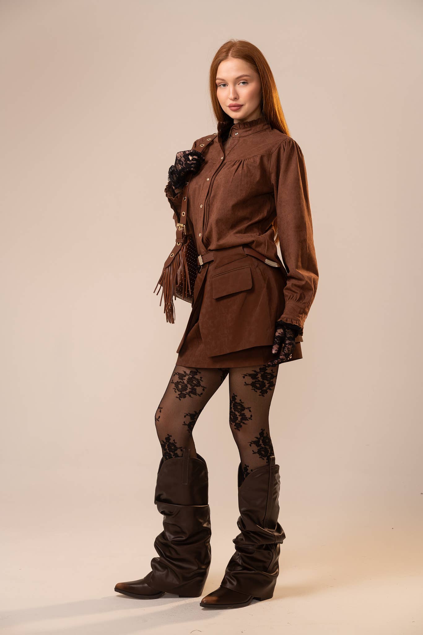Elevate your everyday western style with our Suede Ruffle Snap Western Blouse. Crafted from a soft, suede-like fabric, this long-sleeve blouse features a romantic ruffled stand collar and classic western snap buttons for a timeless cowgirl feel.