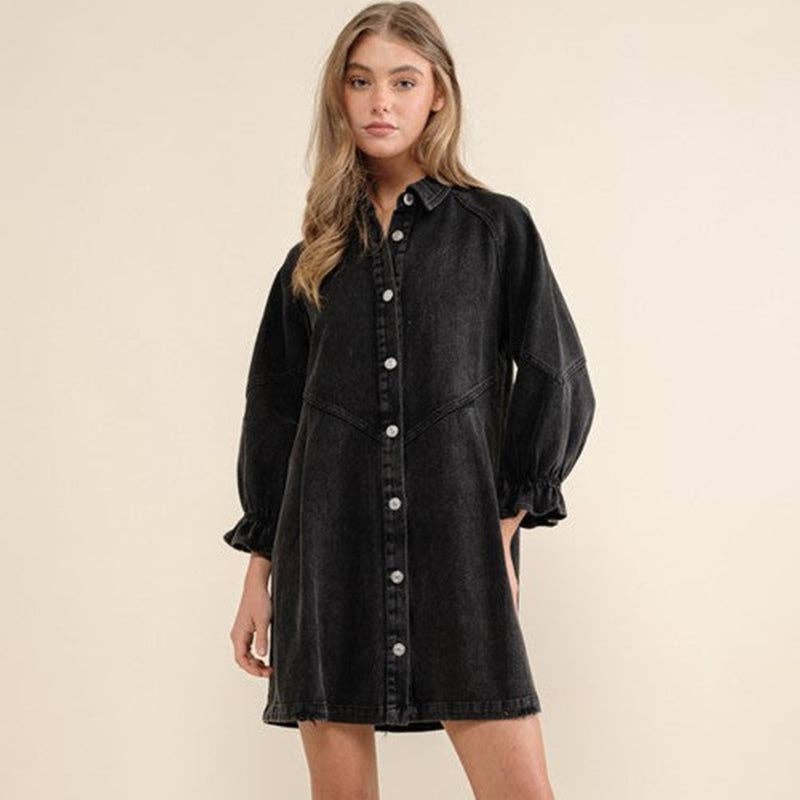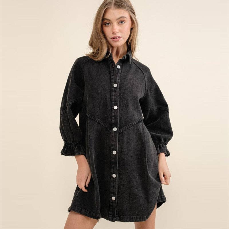 Elevate your wardrobe with our 3/4 Lantern Sleeve Denim Dress. The ruffled design exudes femininity while the buttoned front adds a trendy twist. Made with classic denim fabric, it's perfect for any occasion - casual or dressy. Pair it with your favorite accessories for a chic and effortless look.