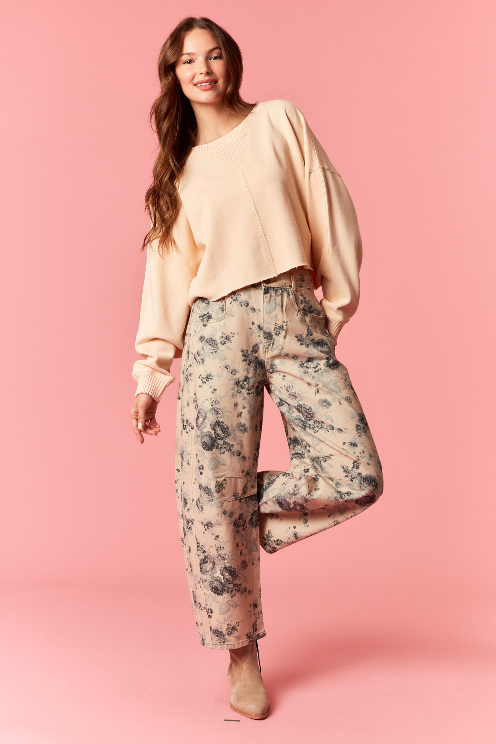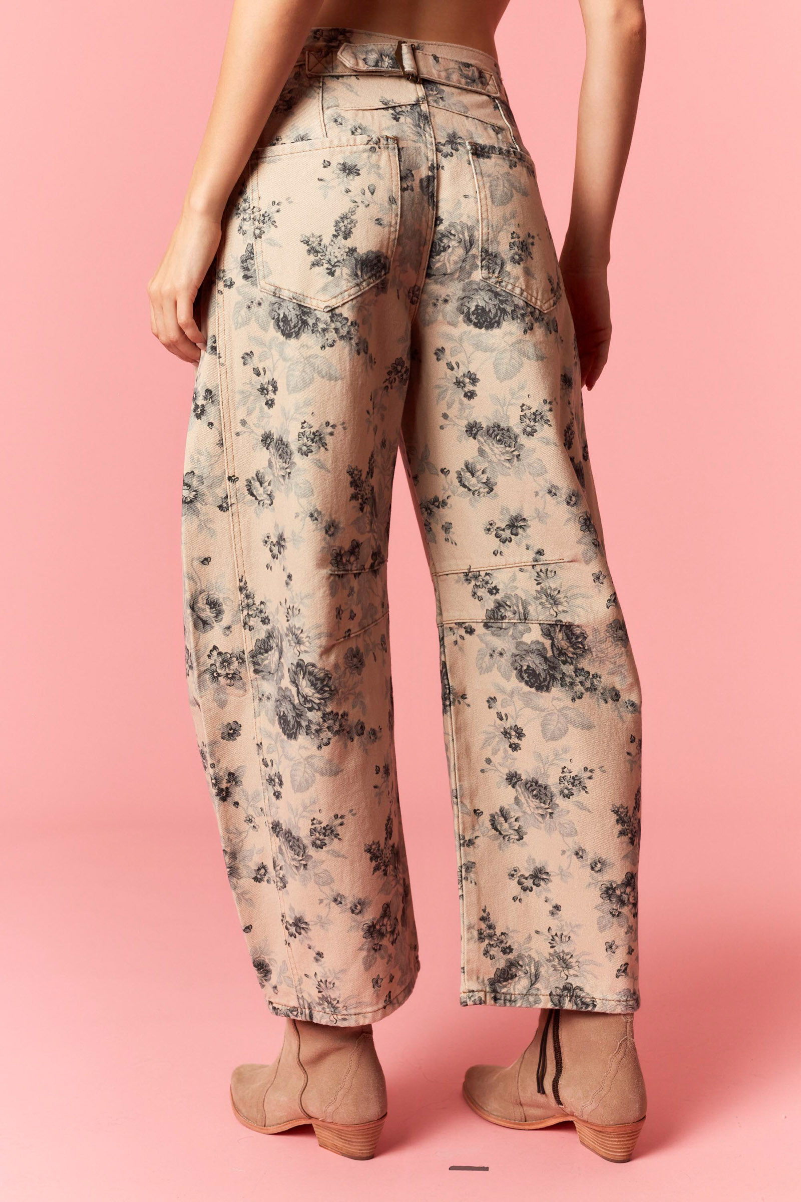 Turn heads with these statement-making Back Buckle Strap Rose Printed Barrel Jeans. Designed with a modern barrel silhouette and a bold all-over rose print, these jeans blend edgy western flair with fashion-forward style. The adjustable back buckle strap adds a unique detail that cinches the waist for a flattering fit, while the relaxed barrel leg keeps the look effortlessly cool.