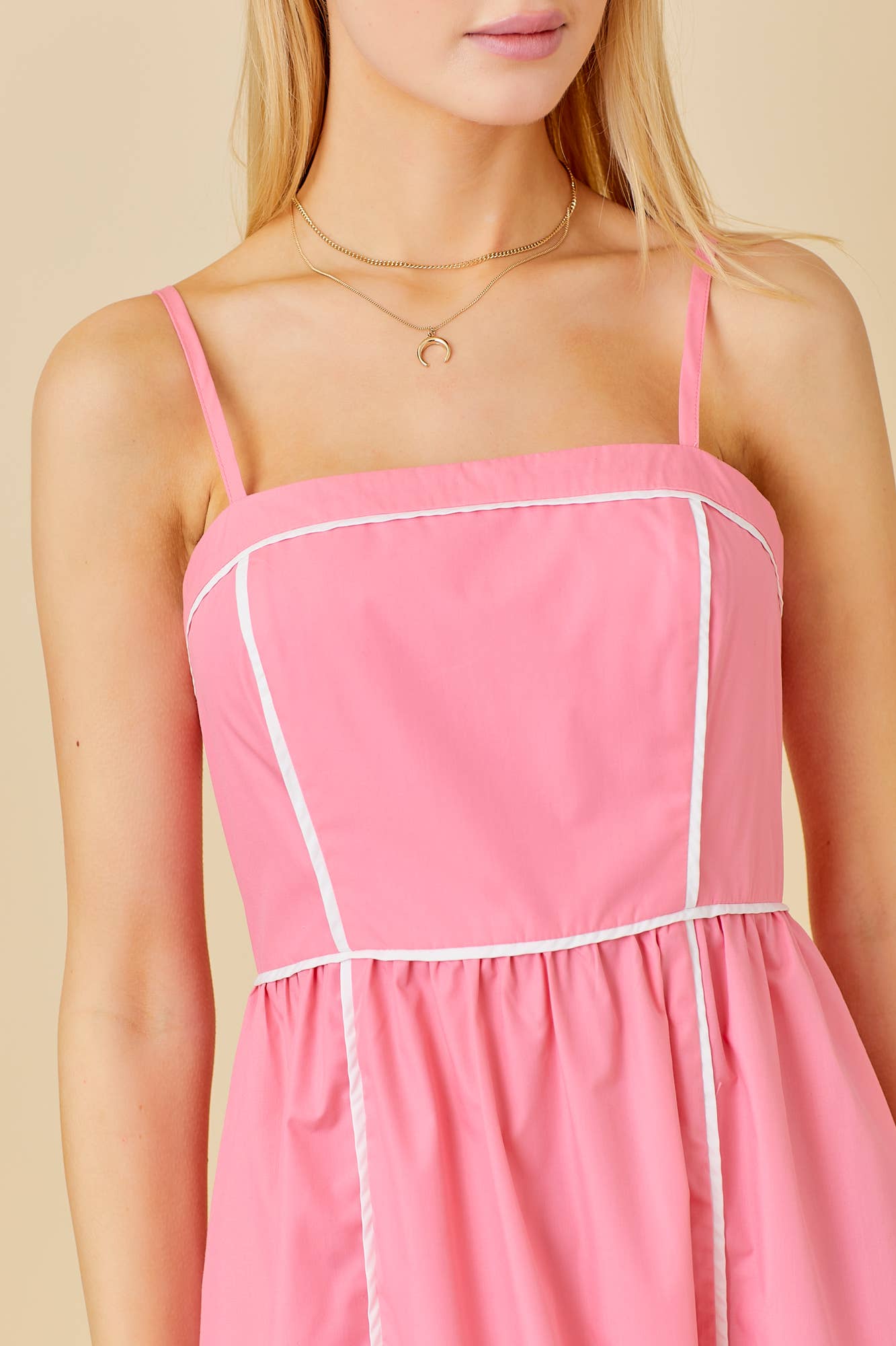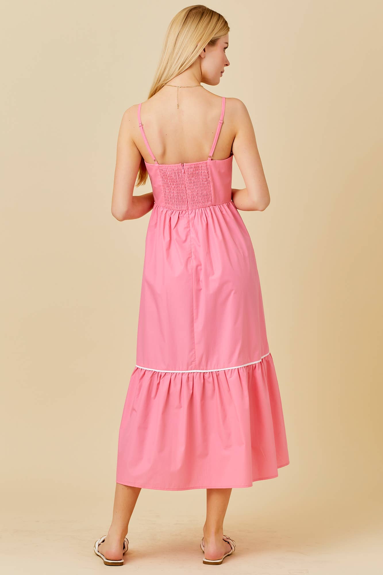 This lightweight midi dress is perfect for a sunny day or a night out. The bright pink color is accented with contrasting piping, adding a playful touch to this versatile piece. It's a must-have for any summer wardrobe!