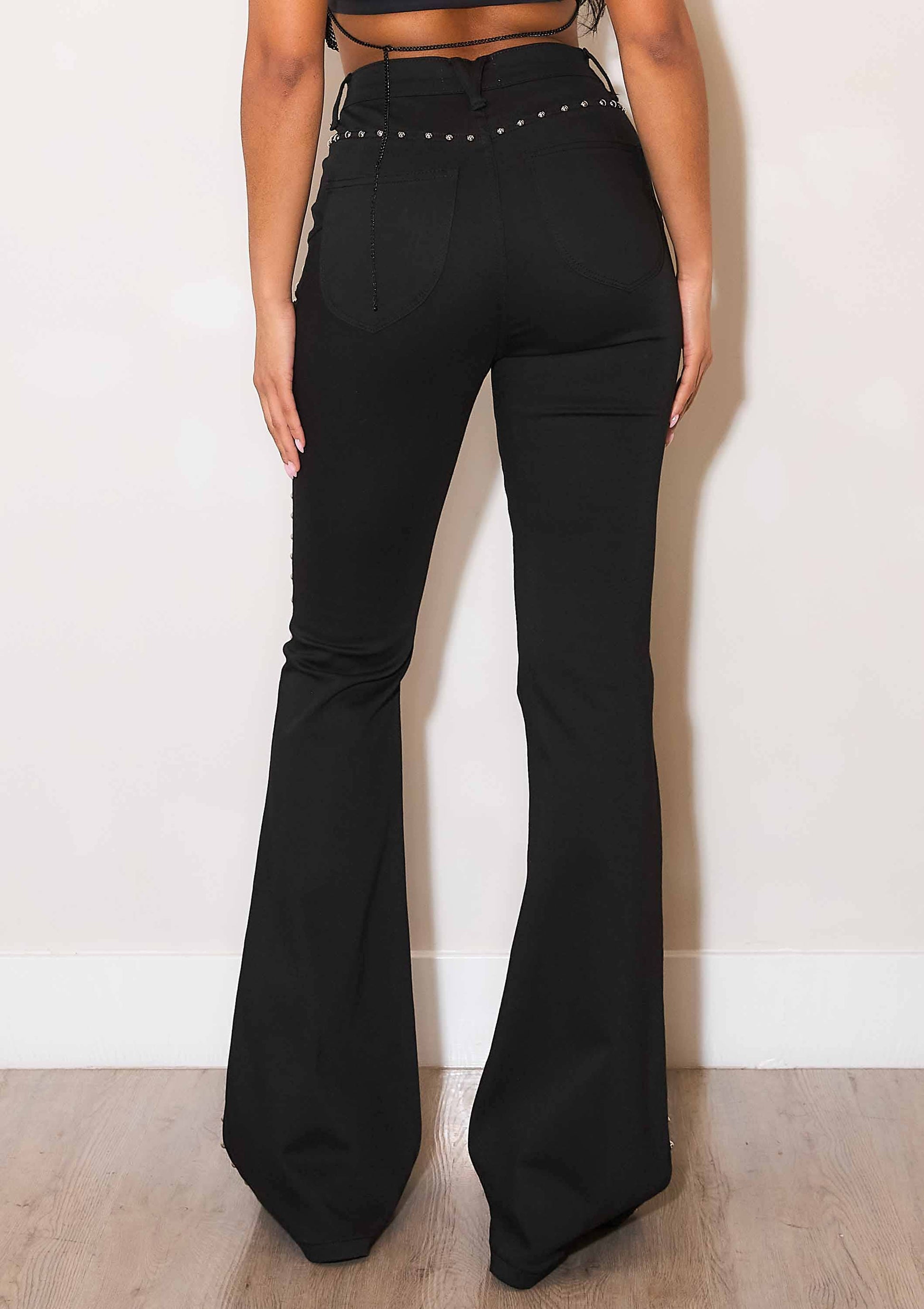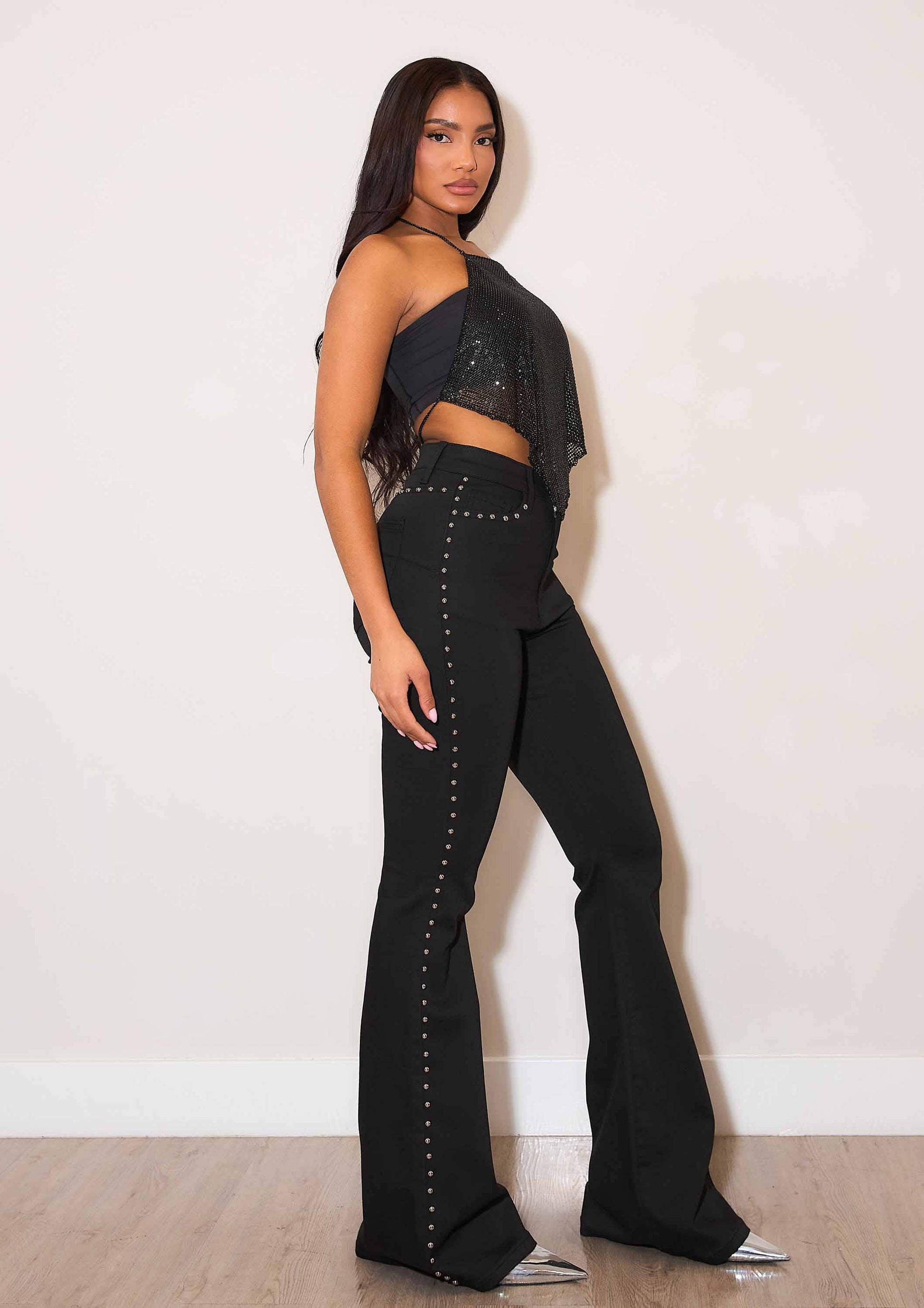 Step out with a little edge in the Whiskey Kiss Black Studded Flare jeans. These flared favorites feature standout stud details, classic five-pocket style, and a smooth zip-fly closure. With a comfortable 11.5" rise and a long 33" inseam, they hug just right whether you’re dancing through the day or owning the night. Perfect fit for making every move a stylish statement!