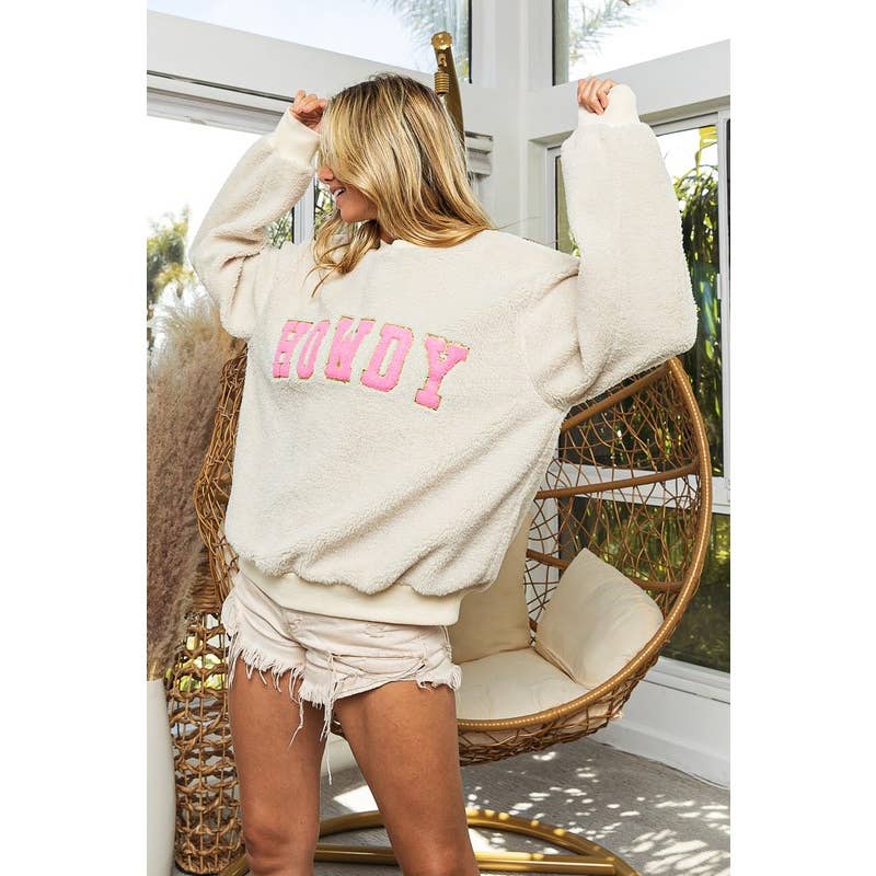 Stay warm and stand out with The Howdy Sherpa Pullover. Crafted from ultra-soft sherpa fabric, it delivers unmatched coziness and a plush feel that wraps you in comfort on chilly days. Featuring eye-catching letter patches, this pullover isn’t just about warmth—it makes a bold, stylish statement. Elevate your cold-weather wardrobe with a piece that combines irresistible softness and standout design.