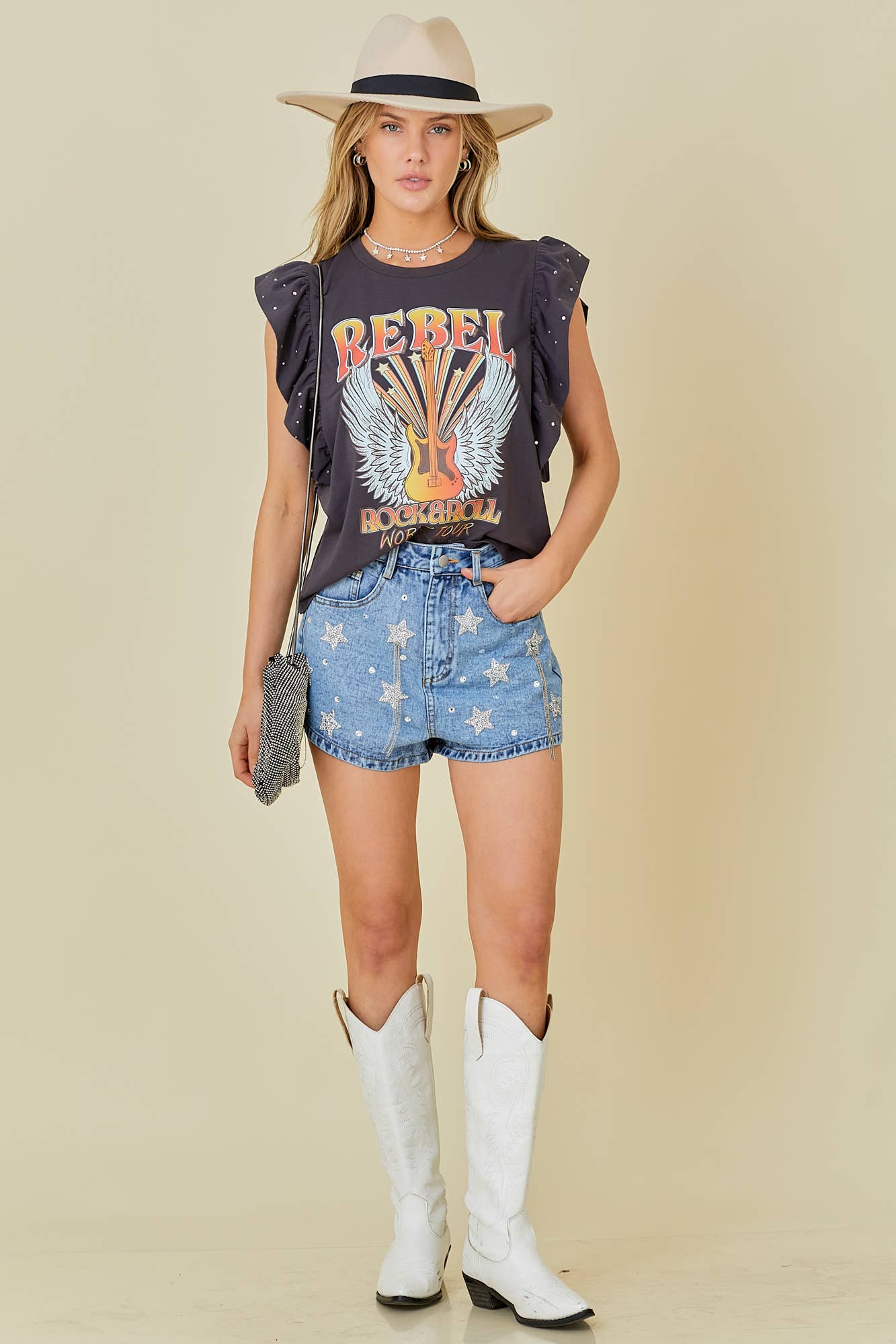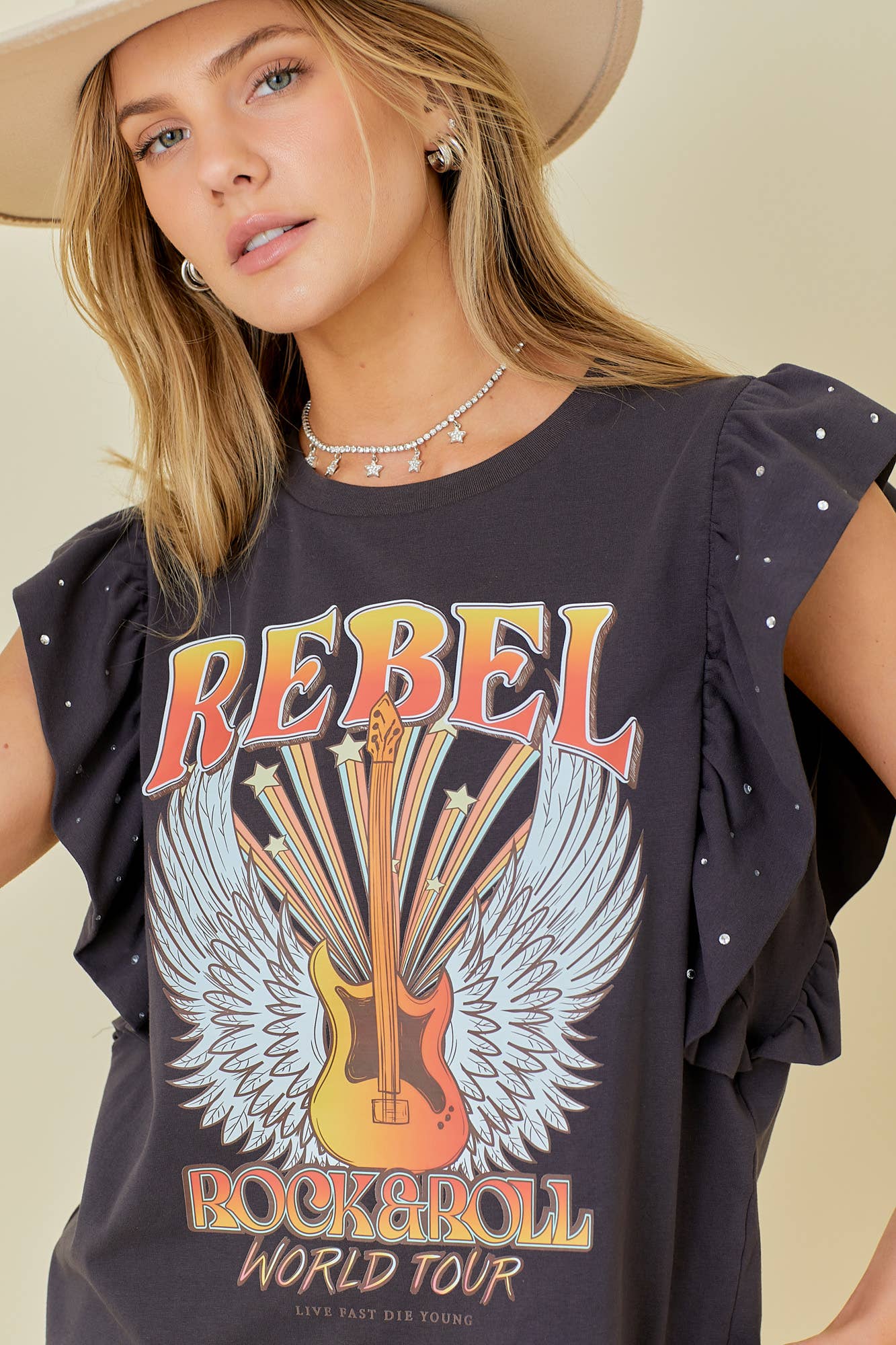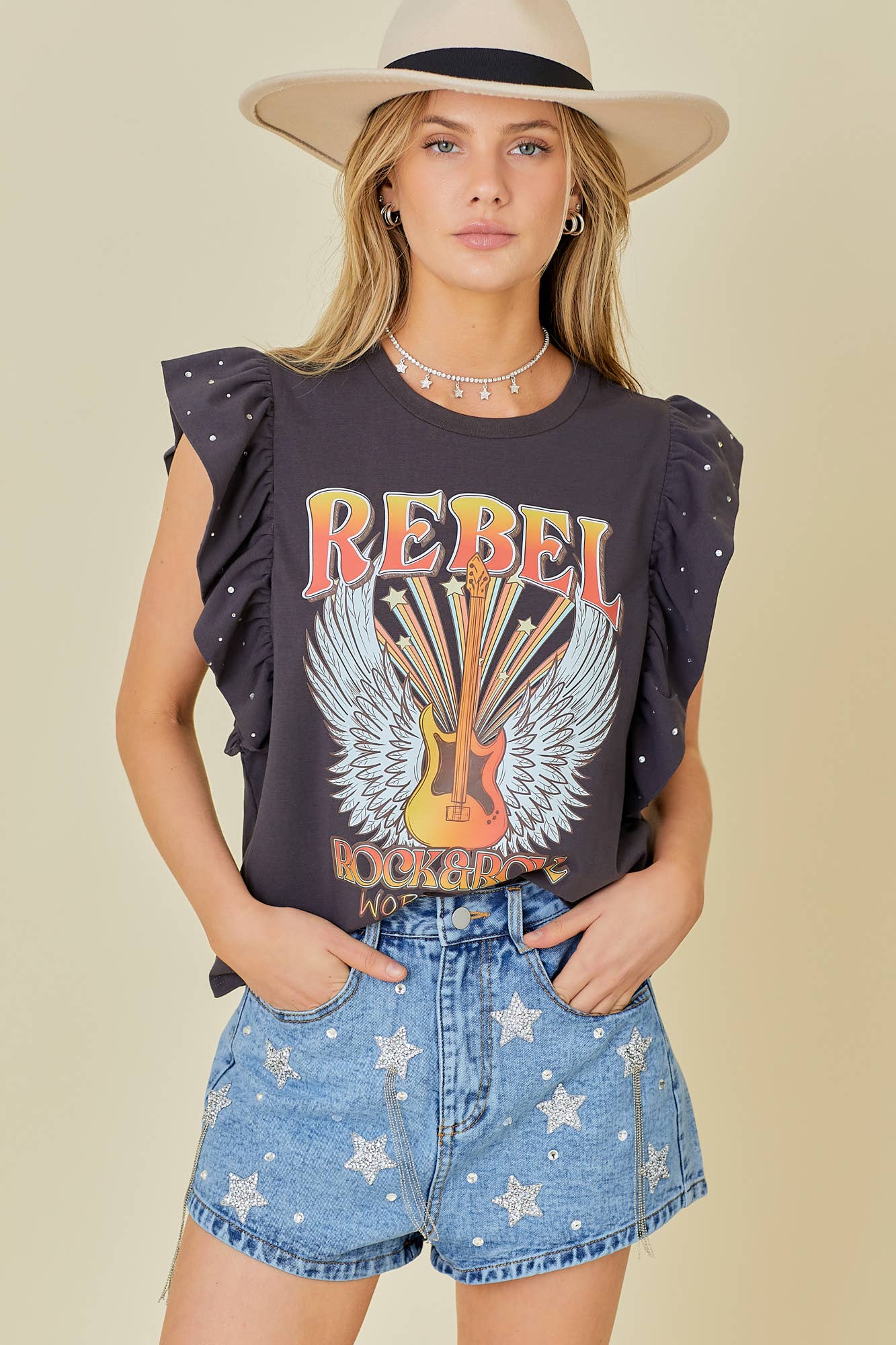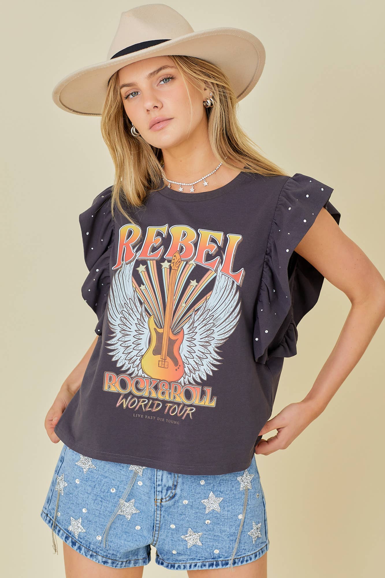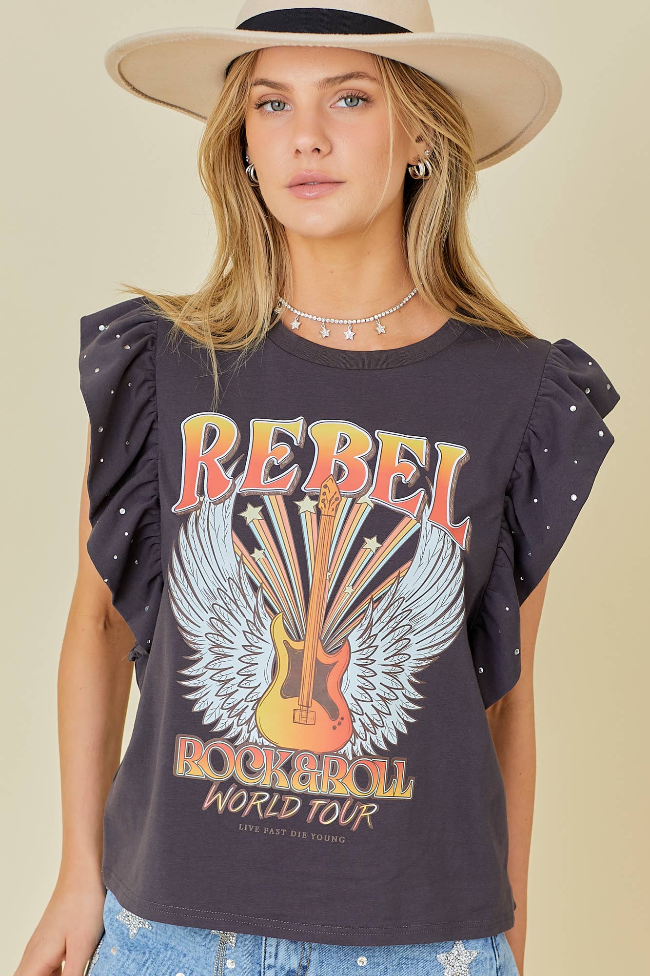 Rock n Roll Print Rhinestone Ruffle Top