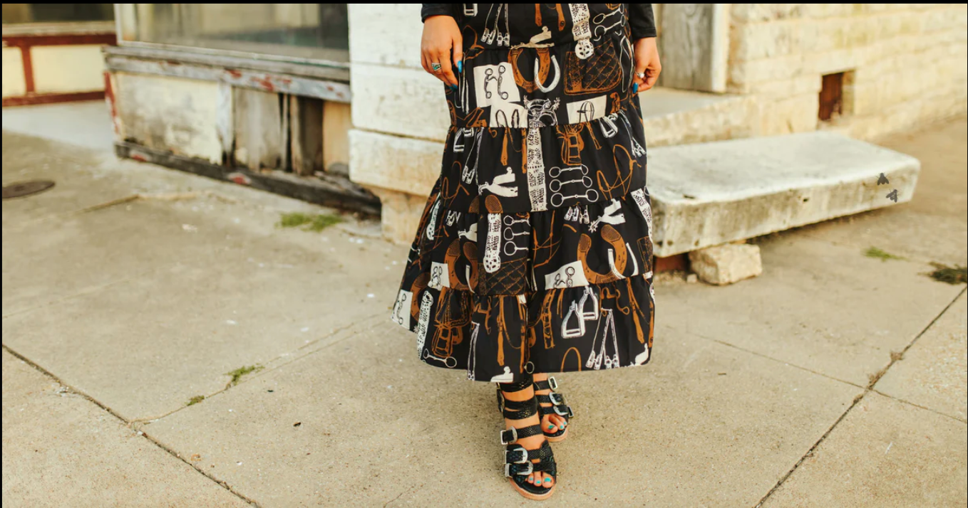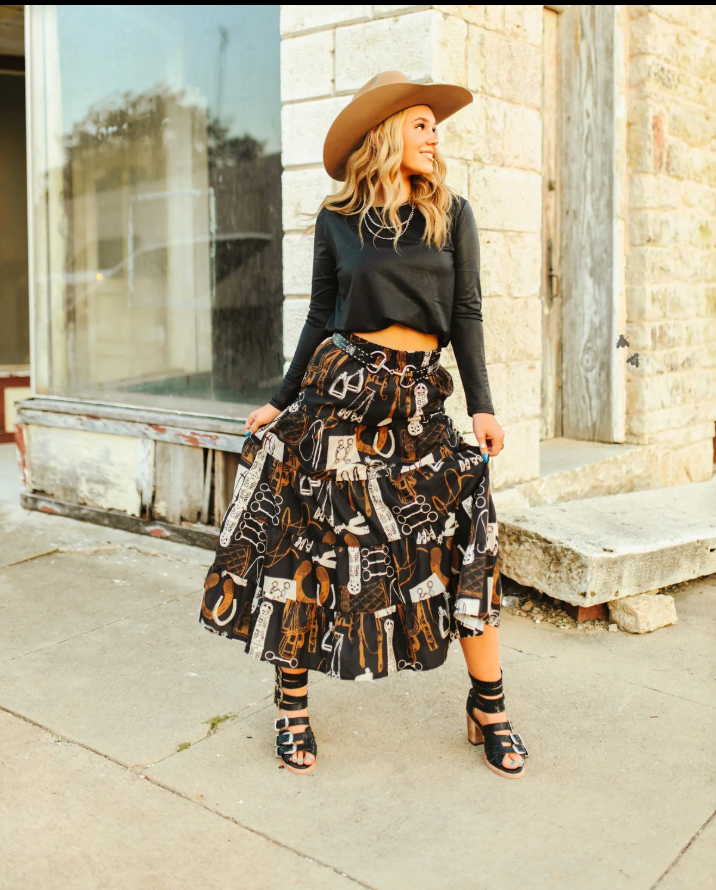 Introducing our Western Print Maxi Skirt, perfect for making a statement! The unique western print is sure to catch attention. Dress it up with boots and a belt, and maybe even add some turquoise jewelry for a bold and stylish look.
