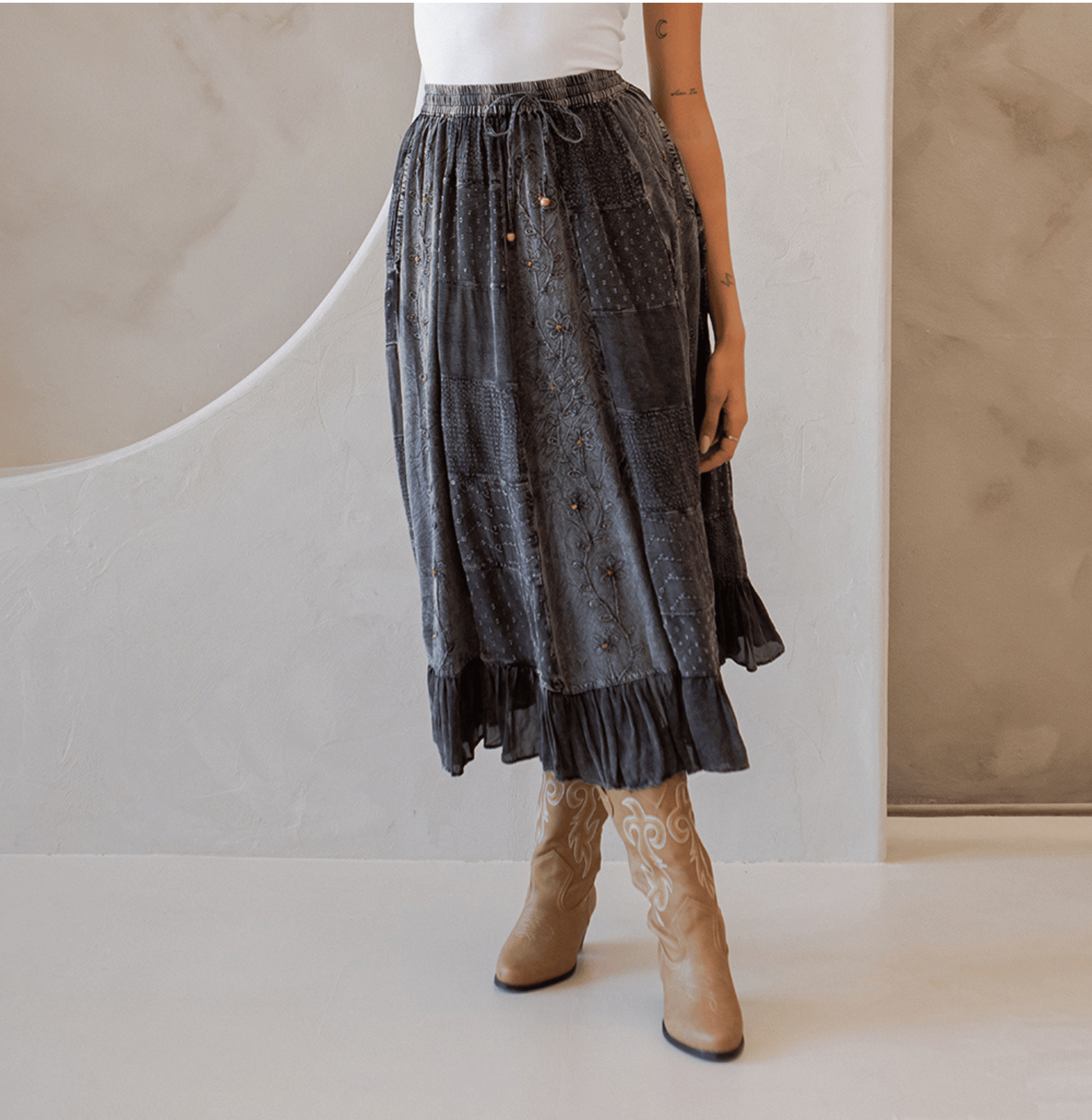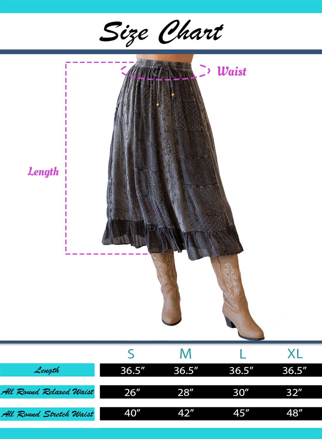 This Women Patchwork Embroidered Maxi Skirt is a fun and unique addition to any wardrobe. With its Western patchwork design, embroidered details, and ruffled hem, it's sure to stand out. The crinkled and overdyed fabric adds character and the draw strings and elasticated waist provide a comfortable fit. Plus, the pockets add convenience. (Note: Slight color variation may occur due to hand dyeing process.)